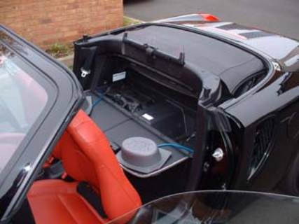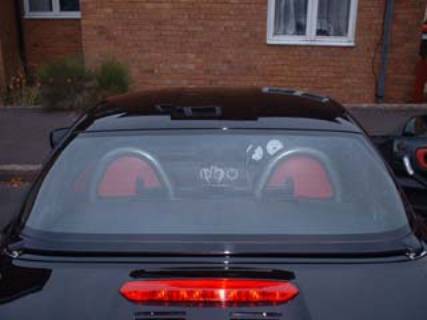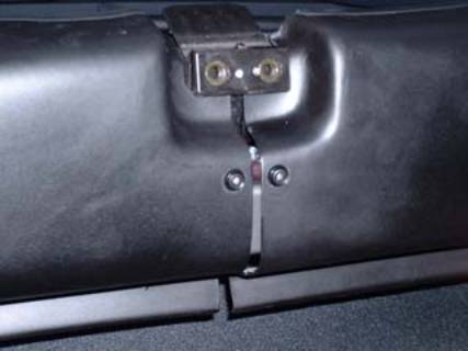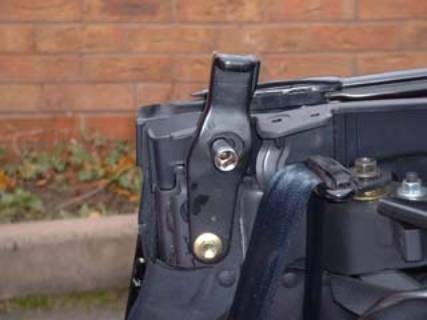 3 – Remove the wind deflector by taking out the black plastic part below the hinges to expose the bolts, and then take the four nuts off to allow you to remove the deflector, then remove the 'pull' handle that releases the soft top – remove the plastic cover then remove the two screws inside.