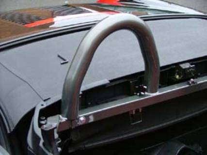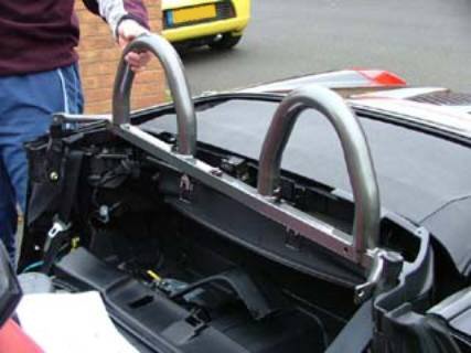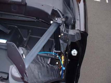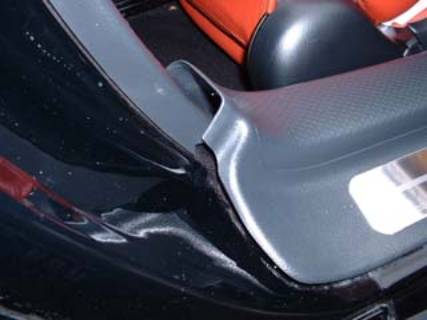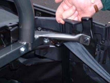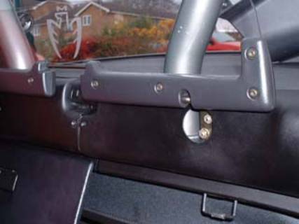 7 – Replace the side trim (with the seat belts), don't forget to replace the white clips onto the trim if you haven't already; to place them, (if you have hard top fixings only) you have to bend their top at the level of the hoops; you will now need to cut off the protruding tabs so that the trim will sit flush on top of the bar (see picture, tab is above the black section that hangs over the bar support). Also take care to replace the two fasteners into each side at their exact place on the frame (where there is no paint).