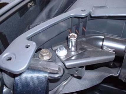 5 – Remove the four M8 screws on the car (see pictures, socket shows which bolts to remove) then place the bars on top of the existing transversal support. Replace the removed bolts with the two M8 x 60 (long bolts, vertical hole) and two M8 x 30 (shorter bolts, horizontal hole – use the round spacers also if you DO NOT have hardtop fixings), using the small size washers on all four bolts.