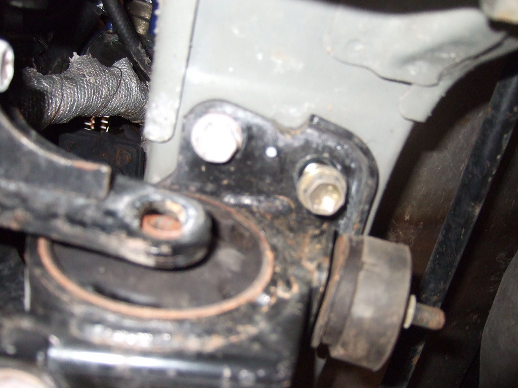 You then have to take the mount off the chassis member. 3 bolts in the case of the front one, 4 in the case of the rear. Here is a view of the front one. The centre bolt is already out, and 1 of the 4 mounting bolts is partially undone..
