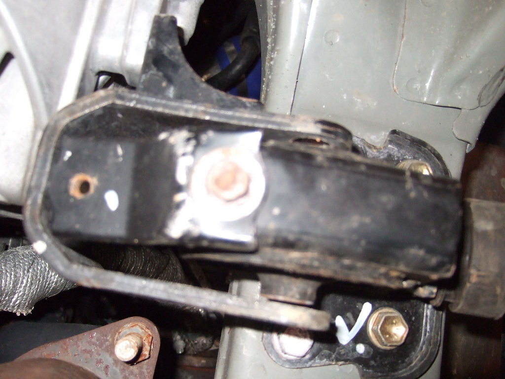Again on Jason's we noticed that one of the chassis mounting bolts on the rear bracket was longer than the others, probably as a result of his engine "takeouts". This proved very useful. Alignment of the bracket was being a bit difficult. With I a bit persuading we managed to align the bracket with one hole and screw in the longer bolt (the shorter ones would not have reached). We then did this one up and used it to pull the bracket towards the chassis member and align the other bolt holes.