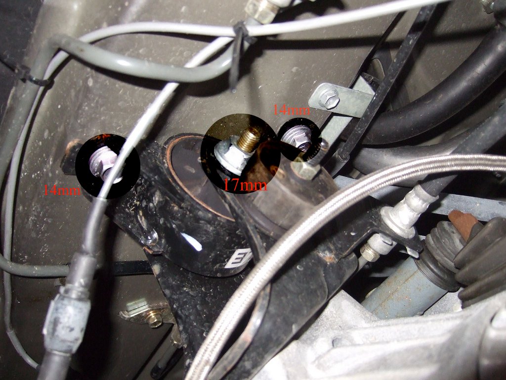 The first job on each mount is to take the centre bolt out with 17mm tools. This is done up tight so the torque wrench or a breaker bar could be very useful. With the nut off the bolt should slide out or unscrew fairly easily. Here is a picture of the mount nearest to the front of the car. The large 17mm nut is highlighted as are 2 of the 3 x 14mm bolts.