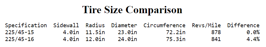 Quote from: Dev on October 14, 2021, 13:23I haven't checked your math however the profile of the tire is tied to the percentage of the width so the wider tire with the same profile being 45 would be taller and therefore have a different percentage for revs per mile. How much more I do not know but the calculator would tell you.
